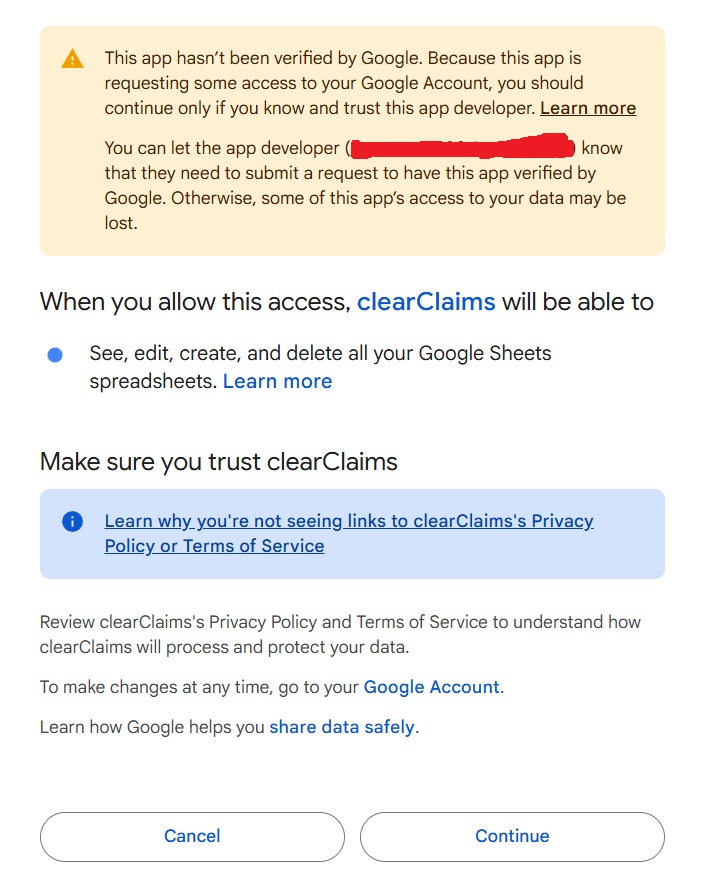 To use the automated features (the buttons), you must give the script one-time permission to run in your account. This is completely safe, as the script was copied from a trusted source (me!).