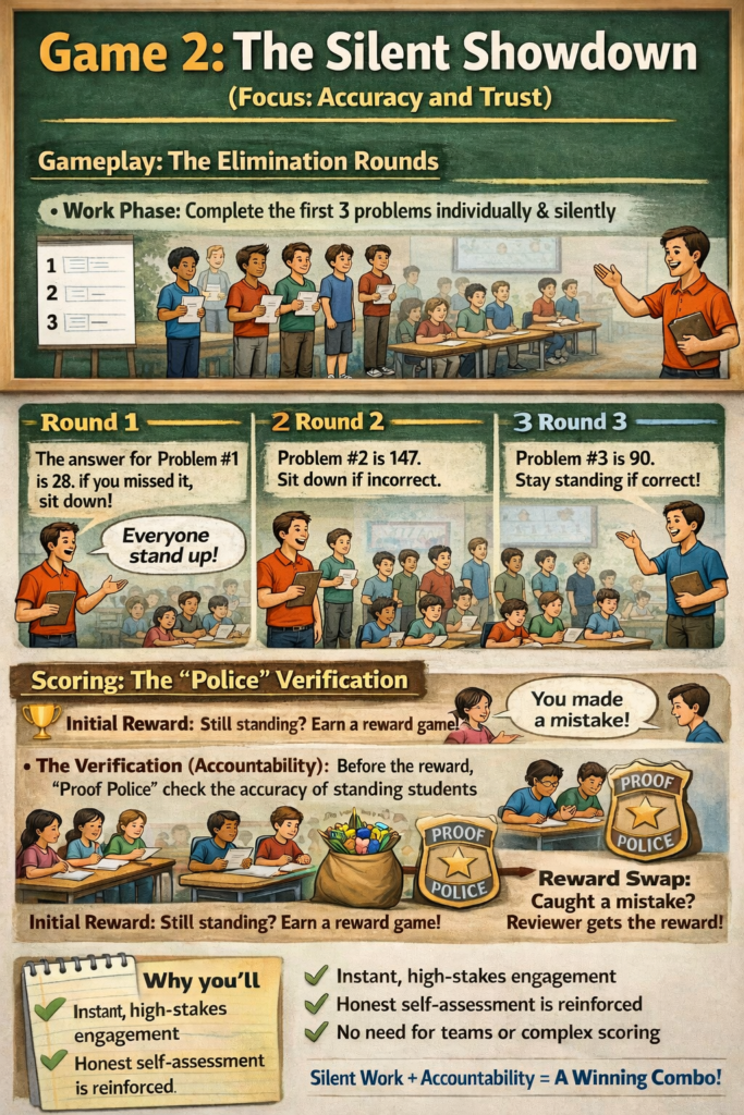 • The Verification (Accountability): Before the reward is granted, students who sit down will now become the “Proof Police” and check the work of the students still standing.