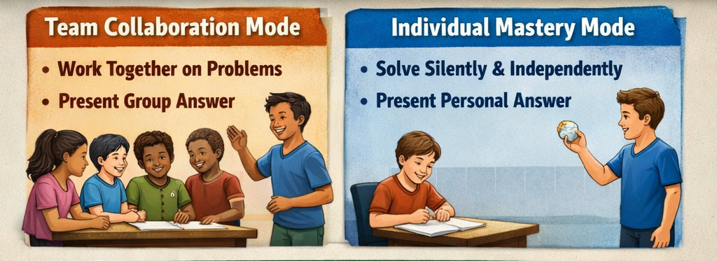 • Answer Phase: The teacher randomly selects one student from the team to stand and present the group’s agreed-upon answer and work.
